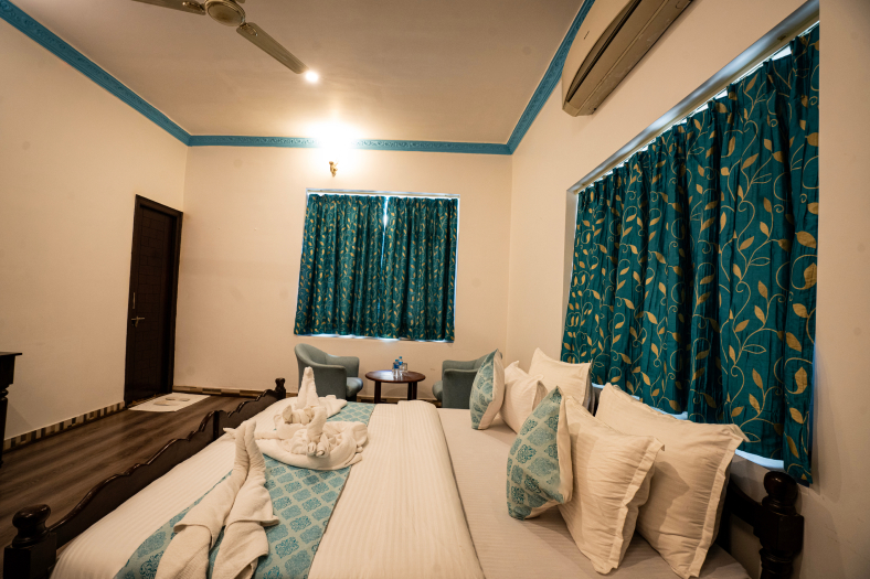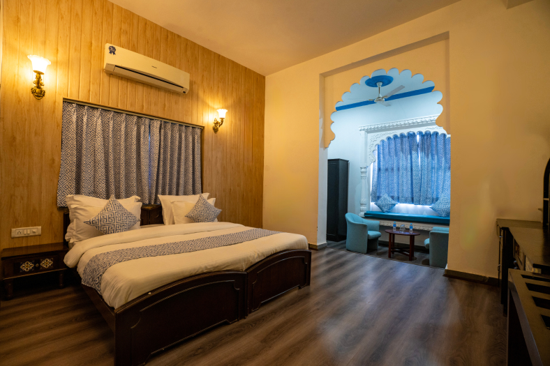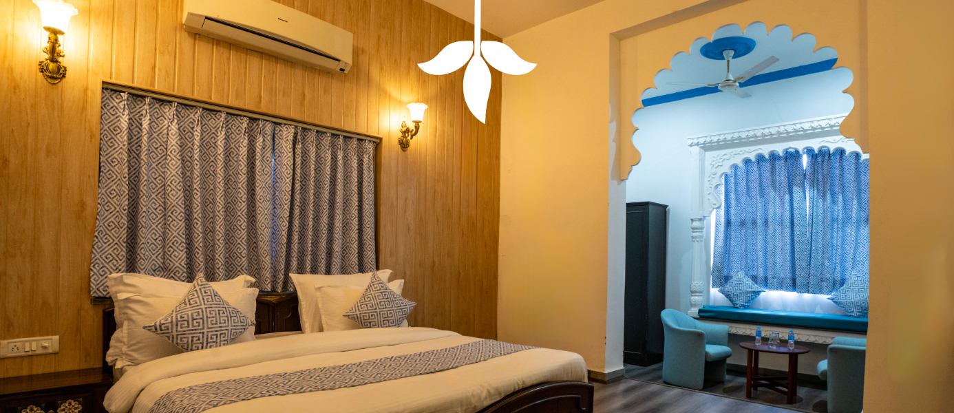 Enjoy elegantly designed rooms that reflect Rajasthan’s grandeur and modern amenities for a relaxing stay.